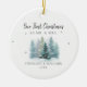 A watercolor scene of a mountain pine forest under snow sets the stage for this delicate, elegant and simple Christmas ornament keepsake for a newlywed couple with the title "Our First Christmas as Mr & Mrs", that also features modern calligraphy. Modern, simple and elegant.