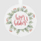 First Christmas as nanny and grandad is a precious time to be celebrated and this lovely keepsake, with their new baby grandchild's photo will be treasured and a lovely memory to hang on their tree in years to come! On each side is a Christmassy border of festive green leaves and red berries. On the front, simply replace the sample photo in the middle with that of your own baby. Choose a picture where your baby's face is centered so it will fit correctly into the circular shape. You can easily personalise the text with your son or daughter's name and the year curved beneath the photo, and First Christmas as Nanny & Grandad is curved at the top, but this can be easily changed to grandma and grandpa, gran and gramps, or whatever you wish. On the other side, Happy Holidays is in a set elegant script red typography with the same leafy border.