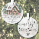 Elegant Script First Christmas New Home Ornament. Celebrate the joy of your first holiday season in your new home with this beautifully designed, custom ornament, perfect for commemorating your "First Christmas In Our Home." The front features elegant script calligraphy and a classic serif font, along with the year for a personal touch. A charming watercolor artwork of a cozy winter cabin nestled among evergreens and accented with hints of red holly berries brings a warm, festive touch to the design. Black heart accents and a soft white ombre effect at the base of the artwork add sophistication, and both the font and heart colors can be customized to match your style. This keepsake ornament is a thoughtful way to celebrate a memorable milestone and makes an ideal housewarming gift for anyone enjoying their first holiday in a new home.