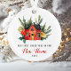 Celebrate your first Christmas in your new home with this cute keepsake ornament, featuring a watercolor painting of a cozy red cottage surrounded by green and yellow winter foliage. The text reads "Our First Christmas in Our New Home," with the words "New Home" in red calligraphy and the remaining text in charcoal gray.