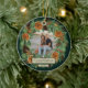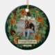 Commemorate your most meaningful holiday memories with this custom photo ornament from the Rustic Dried Orange and Pine Holiday Collection by Porch and Gable Design. The front showcases a watercolor wreath of pine, dried oranges, cinnamon sticks, eucalyptus, pine cones, and brass bells on a rich green background, elegantly framing a customizable photo space. Beneath the photo, there’s room for a personalized message that reads “Our First Christmas”, along with space for the couple’s name and a special date. On the back, the design continues with a coordinating dark green background and additional customizable space for a personal message, wedding date, or treasured memory.