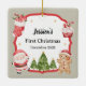 This First Christmas watercolour tree decoration is suitable for a baby boy or girl. The design includes a snow-colored background, snowflakes, Christmas trees, stocking, cupcake, santa claus and gingerbread character. The text includes baby's first name, first christmas and the year.