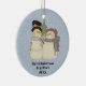Loving snow couple is celebrating their first Christmas together. Both are wearing striped scrarves and hats. The front says First Christmas Together and the year. The back says Happy Holidays and has some holly & berries.