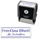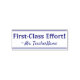 This positive rubber stamp design features the positive feedback message "First-Class Effort!" and a personalized teacher name. It could be used by a school teacher or educator when marking assignments, to acknowledge that the student has done a great job.
