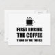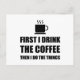 Fans of hot morning brewed caffeine beverages joke before work first I drink the coffee then I do the things. Check out this funny custom design on tees, shirts, mugs, cases, gifts and apparel.