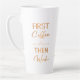 Simple faux gold copper metallic glitter "First coffee then work" motivational quote typography script, a latte mug and two little hearts making a funny cute office mug.