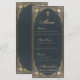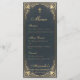 This elegant menu with a vintage air, recommended for a boy's first communion, has on both sides a golden baroque decorative frame on a dark blue background. The name, the title "Menu" and the subtitles are written in an elegant calligraphic script. All text can be personalized and has a golden color similar to the golden frame. There is a (faux) gold cross above the text.