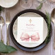 A white background color. Decorated with a large pink bow and a golden cross. Personalize and add the name, date and a text.