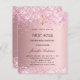 A blush pink gradient background. Decorated with pink faux glitter, confetti and a cross. Personalize and add a name and details. The name is written with a hand lettered style script