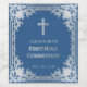 This elegant blue and silver religious design with a vintage air, recommended for a boy, has an ornate faux silver foil frame with elegant baroque decorations on a classic blue background. Above the text there is a religious cross in faux silver foil. The occasion is also in faux silver; the rest of the text has a silvery gray color similar to the faux silver frame.