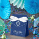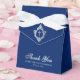 An elegant royal blue and silver boy first communion favor box. On the flap, it has vintage crest with a cross in it, both from faux silver foil.