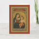 This reverent First Holy Communion card from Shower of Roses Shoppe features a vintage-style sacred image of the Blessed Virgin Mary holding the Christ Child, who offers the Sacred Host in a radiant monstrance. Surrounded by illuminated manuscript-style florals and gilded detail, the front reads: “Blessed Be Your First Holy Communion.”