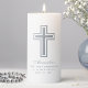 First Communion Faux Silver Cross & Elegant Script Pillar Candle