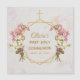 This modern, elegant floral first holy communion magnet has a geometric irregular gold frame with flower bouquets of white and pink orchids on the left and right sides over two gold hexagons that overlay over a white marble background, with a gold cross at its top. The name of the child is written in an elegant calligraphic script; the rest is written in smaller caps. All text has a golden yellow color, like the gold frame.