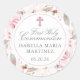 Beautiful blush pink roses frame this elegant First Holy Communion envelope seal. A soft mauve pink cross also decorates this sticker. First Holy Communion is written in a beautiful and traditional script font. your daughter's name is written in capital letters with the date below. You can also use it as a favor seal. This item is part of the Pink Rose and Peony collection. It contains templates to create your own invitation stationery, welcome signs, and party decorations. The let you spend more time enjoying your celebration and less time planning it!