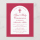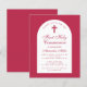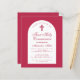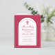 An invitation for a girl's first communion. On a modern color between magenta and red, it has a white arch with magenta red text inside. The occasion and the name are written in an elegant calligraphic script; the first line is arched text.