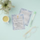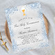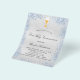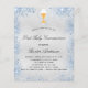 Faux silver metallic looking background decorated with blue faux glitter dust a golden chalice and a host. Personalize and add a name and reception details. Black colored letters.