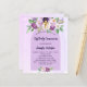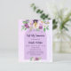 A violet, lavender watercolored background. Decorated with violet and purple watercolored flowers and a golden cross. Personalize and add your name and reception details.
