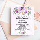 A violet, lavender watercolored background. Decorated with violet and purple watercolored flowers and greenery and a golden cross. Personalize and add your name and reception details.