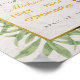This elegant first communion design has green willow leaves around faux gold foil frame with white marble interior, containing the text Above the text, partly in a triangle on the upper part of the frame, there is a faux gold foil cross. The name is written in an elegant calligraphic script, the rest in caps. The name and the occasion are golden, the rest of the text is gray. The background is white marble.