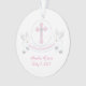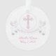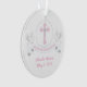 A stylish First Holy Communion ornament with two white doves holding a congratulations banner and a pink and gray crucifix. The background has a soft pink floral pattern. This coordinates with other pieces available in store and can be customized as desired. (Some graphics AMBillustrations ©2017)