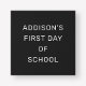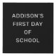 This simple and stylish "First day of school" sign features a letter board look with a solid black printed background and white ALL CAPS sans serif lettering. Text and design can be completely personalized with the student's name or other wording.