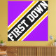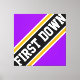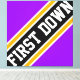 This sporty football design features athletic FIRST DOWN text inside highlighted wide diagonal black, white, and golden yellow orange racing stripes against bright purple background. The first and last letters of the text run off the design edges with a dynamic banner effect. The colors and text in this design can be personalized.