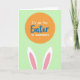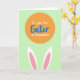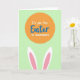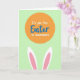 This design shows a pastel green background with a large orange circle near the top, creating a fresh, cheerful contrast 🌷. Inside the circle, the text “It’s your first” sits above “AS GRANDPARENTS” in rounded white lettering, centered and easy to read. The word “Easter” is placed as the main focus in a flowing blue cursive-style font, slightly larger than the rest so it stands out. The overall look uses flat, even lighting and simple shapes, keeping the message front and center without extra clutter. At the bottom edge, two long bunny ears rise into view, outlined in white with soft pink inner shading 🐰. Their close, side-by-side placement feels like a gentle pair leaning in together, adding a sweet, affectionate touch to the announcement. A faint texture behind the shapes gives the background a lightly brushed look, while the ears remain crisp against the green field. The tall ears curve upward from the lower border, with the pink centers tapering neatly toward the rounded tips.