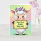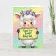 This card shows a cute, lamb-like character centered on a soft pastel gradient background, with fluffy white fleece and big brown eyes that look warmly toward the viewer as if sharing a gentle hello. A faint blush on its cheeks and a small smile add a sweet, friendly tone, like it’s posing for someone it cares about. Around its head sits a spring flower crown of purple and lavender blooms with fresh green leaves, bringing in a 🌷 touch of seasonal color. The character holds a bright yellow rectangular sign with a simple wood-look frame, gripped by dark hooves and mitten-like hands. Across the middle of the sign, the message “Happy First Easter Baby Girl” is written in rounded green lettering that stands out clearly against the yellow. The lighting stays soft and airy, and the background shifts smoothly through pale greens, yellows, pinks, and blues, keeping the scene gentle and calm. The character’s fluffy texture is detailed, with tiny curls of fleece and a slight shine in the eyes that adds a tender, affectionate look 🐰. The yellow sign sits centered in front of the character, bordered by a thin wooden frame, with the green text placed neatly across its face.
