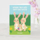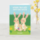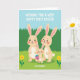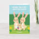 This card shows a trio of bunny characters 🐰 standing close together in the center, with two taller figures gently curving their arms around a smaller one in a way that reads like a tender family hug. They stand on a spring-green grassy field beneath a pale blue sky, with a darker band of leafy shapes stretching across the horizon. The bunnies have soft peach-colored fur with rosy cheeks and pink inner ears, and their faces tilt toward one another as if sharing a quiet, affectionate moment. Near the top, a short greeting line sits in a simple style, set in a darker tone that contrasts against the light sky. The smallest bunny holds an Easter egg close to its chest, as if proudly showing it off to the others, adding a sweet note of togetherness 🐇. The egg is decorated with blue, purple, and pink geometric stripes that stand out against the warm fur tones. Two small yellow flowers rise from the grass on either side of the family, their round petals bright against the green.