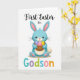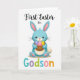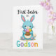Designed with a soft blue bunny as the main character, this digital illustration shows it sitting calmly with a tender, friendly gaze 🐰. The bunny has large expressive eyes, light pink inner ears, and matching pink paw pads, giving it a gentle, affectionate look. In its arms, it holds a woven basket that feels like a small gift being offered, adding a quiet note of closeness to the scene. Inside the basket are three decorated eggs: one with purple stripes, one with pink dots, and one with yellow stripes. The background stays plain white so the character, basket texture, and colors stand out clearly. Near the top, “First Easter” appears in dark lettering with a smaller “For” placed close by, while “Godson” sits below in multi-colored letters 🌷. A fluffy white tail peeks out from behind the bunny, just to one side of the basket.