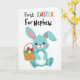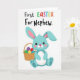 This card features a stylized aqua-blue bunny sitting on a bright white background, with pink inner ears, a tiny nose, and rosy cheeks that give it a sweet, friendly look 🐰. Its large black eyes have small white highlights, and the slightly tilted ear adds a bashful, affectionate touch, like it’s posing for someone it cares about. The bunny holds a smooth white oval close to its lighter belly, as if gently protecting a little gift. To the side, a small woven basket sits nearby, filled with decorated eggs in purple, red, green, yellow, and blue, with a mix of stripes and solid patterns 🌷. Near the top, the phrase “First For Nephew.” appears in black lettering, centered above the main illustration. Just below that, “EASTER” is written in a row of multi-colored letters, each one a different bright shade that echoes the eggs below. The bunny is drawn with rounded shapes and soft shading, and one ear angles outward while the basket rests close by with eggs spilling upward in a neat cluster.