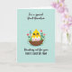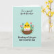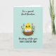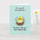 This card shows a fluffy bright yellow chick with big black eyes, rosy cheeks, and a tiny orange beak, nestled low in a simple brown nest on a soft mint green background 🌷. Around the nest, small green leaves and a few pastel blossoms in pink and blue add a gentle, friendly touch, like a little garden arranged for someone special. The chick is shown mid-hatch, with a cracked white eggshell cupping its body, giving the scene a sweet “just arrived” moment that feels like a tender welcome. Along the lower half of the shell, a decorative band alternates red starburst shapes and blue dots, adding a party-like accent without taking over the calm setting. Near the top, a short line of text sits above the chick in a darker, easy-to-read color, addressing a “special Great Grandson” as if spoken softly to him. Near the bottom, a larger line of text in a thicker, simple style reads “FIRST EASTER FUN!” in a strong contrasting shade, balancing the image and drawing the eye downward 🐰. The mint background stays smooth and uncluttered, making the nest, flowers, and patterned eggshell stand out clearly. The brown nest is drawn with curved twig lines, and the eggshell crack is shown with jagged edges above the chick’s head.