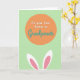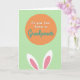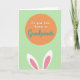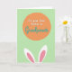 This card features a large orange circle near the upper center, like a warm spring egg or low sun, set against a pale mint-green background 🌷. Inside the circle, the line “It’s your first Easter as” sits near the top in a rounded white font, giving the words a friendly, welcoming look. Directly beneath, “Grandparents” stretches across the middle in a flowing teal letter style that feels like a gentle embrace between close family members. The mix of white and teal text on orange creates an easy focal point without crowding the design. From the bottom edge, a pair of white bunny ears rises into view, as if a shy little visitor is leaning in to share the moment 🐰. Each ear has a soft pink inner section, adding a tender touch that echoes the affectionate tone of the message. The ears are cropped so only the top portions show, with smooth white shapes and pale pink centers against the mint-green field.