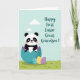This card features a cute, stylized baby animal with black-and-white markings, rosy cheeks, and big friendly eyes peeking up from a cracked egg-shaped shell in teal and purple 🐰. The creature’s gentle smile and slightly tilted head give it a tender, affectionate look, like it’s greeting someone it already trusts. Behind it, a pastel blue sky with a few soft, rounded clouds keeps the scene calm and airy. Along the bottom, a spring-green ground is dotted with a few simple grass blades, framing the main character like a little garden stage 🌷. Near the base of the large shell sit three smaller decorated eggs in cyan, warm yellow, and purple, each topped with white pattern details. In the upper right area, the message “Happy First Easter Great Grandson!” appears in flowing white lettering, standing out clearly against the sky. The overall colors stay soft and bright, with smooth shapes and crisp edges that keep the focus on the sweet moment. The teal-and-purple shell shows jagged crack lines, with the top half resting slightly behind the character’s head.