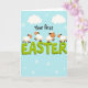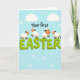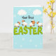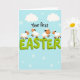 This card features a pastel blue background with scattered white snowflake shapes and soft cloud forms, creating a gentle sky-like setting 🌷. Centered on the front, the phrase “Your first EASTER” is the main focus, with “EASTER” in large lime-green letters that look slightly raised for extra depth. The words “Your first” sit above in a loose, hand-drawn style, smaller and darker so they read clearly without overpowering the headline. Four small lamb-like characters with fluffy white bodies and warm peach faces gather around the big letters, their bright black eyes and curved smiles giving them a sweet, friendly look 🐰. Their tiny black ears and thin legs add to the light, bouncy feel as they appear to skip and dance along the tops of the green letters. The way they lean toward one another and share the space on the word suggests a cozy togetherness, like friends celebrating side by side. White snowflakes and cloud shapes float around the text while the lambs perch across the lime-green “EASTER” lettering.