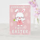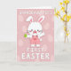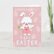 This card features a plump white bunny with long ears tipped in pink, gazing forward with big dark eyes, rosy cheeks, and a small red nose that gives it a friendly, affectionate look 🐰. It wears pastel pink overalls with a heart-shaped pocket and a matching bow tie tucked neatly under its chin, adding a sweet, dressed-up touch. One paw is lifted as if offering a smooth green egg-shaped treat, like a small gift shared between close friends. The background is a soft light pink field with faint outlines of egg shapes and tiny polka dots scattered around, keeping the scene gentle and festive 🌷. Large white lettering with a subtle shadow sits at the top and bottom, standing out clearly against the pink. The top line is placed above the bunny’s ears, while the lower line rests beneath its feet area, framing the character like a keepsake poster. The lighting is even and bright, with crisp edges and a pastel palette that keeps the bunny’s tender smile and raised paw as the main focus. Behind the bunny, pale egg outlines and dotted accents float across the light pink background.