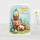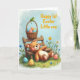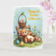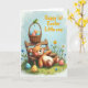 This card shows a chubby plush bear in warm brown tones, reclining on a simple wooden bench with softly pink cheeks and a calm, affectionate look, as if waiting for a close friend to sit nearby 🐰. Above the bear, a woven basket hangs in view, brimming with decorated eggs in gentle pastel blues, pinks, and yellows, each with small stripes and dots. A bright green frog perches on the basket handle, leaning forward with curious eyes that add a light, friendly spark. The background is a wide patch of fresh green grass sprinkled with tiny wildflowers in yellow, blue, and pink, giving the scene a spring garden feel 🌷. Up top, a pale blue sky with scattered clouds keeps the colors soft and airy. The message “Happy 1st Easter Little one” sits prominently across the upper area in cheerful orange letters, standing out clearly against the sky. The bear’s relaxed pose and the frog’s attentive tilt create a tender, companionable moment within the scene. Fine details show the basket’s woven texture, the bench’s wood grain, and the pastel egg patterns clustered just above the bear.