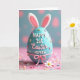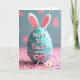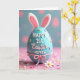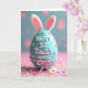 This greeting card features a pastel teal, egg-shaped decoration centered on the front, topped with tall bunny ears that have white outer edges and soft pink inner panels 🐰. A glossy pink ribbon wraps around the middle and meets in a tidy bow, adding a sweet, affectionate touch like a gift meant for someone close. Across the egg’s face, raised lettering in white and light pink reads “HAPPY 1st Easter NEPHEW,” with the words stacked neatly and easy to spot. The egg sits on a rich pink surface that feels like a festive tabletop, setting a cozy, friendly mood. Behind it, the background fades into warm, out-of-focus golden circles of light that suggest a gentle, candlelit glow. Near the base, tiny candy-like sprinkles in several bright colors mingle with a small white flower with five petals and a sunny yellow center 🌷. Soft lighting highlights the smooth finish of the egg, the shine of the ribbon, and the scattered sprinkles around the flower. The scene shows a teal egg with pink ears and a pink bow against a pink foreground, with golden bokeh lights behind it.