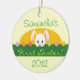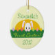 An adorable First Easter peeking bunny double sided ceramic ornament. Ornament is round and features a cute bunny in a spring garden with Easter eggs on a light yellow ceramic background. The ornament reads "First Easter" in a lovely green lettering, with template areas for you to personalize it with your child's name and year. To alter the font color, style, or size simply click on 'customize' and those options will also be available to you. A special keepsake ornament to add to your Easter holiday tree or holiday decor, and is a great holiday gift for friends and family too! This peeking bunny design is available on cards and other gift items too. Please visit our shop for more Easter, and spring greeting cards, stamps, gifts and more!