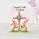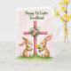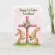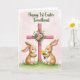 This card features two long-eared, humanlike rabbits with soft brown fur and gentle, wide eyes, sitting on a bright green patch of grass beside a tall pink cross 🌷. A small cluster of pink roses with leafy green sprigs and tiny yellow buds decorates the cross where the beams meet, adding a sweet touch that feels like a shared celebration. On the right, one rabbit leans slightly forward as it offers a petite bunch of yellow spring flowers, giving the moment a tender, affectionate tone 🐰. On the left, the other rabbit holds its paws together near its chest, as if quietly admiring the gift and the scene between them. Behind them, the background fades into a soft wash of pale pinks, like a light watercolor sky that keeps everything calm and airy. Near the top, the phrase “Happy 1st Easter Sweetheart” appears in green lettering, centered above the illustration. The pink cross stands between the rabbits, with the rose cluster sitting right at the intersection and the grass forming a rounded base beneath their feet.