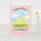 The front design shows two fluffy yellow feathered creatures facing each other inside a sunny yellow oval frame, their tiny orange beaks and feet angled as if sharing a tender moment of friendship. A strip of green grass runs along the bottom with small red blossoms scattered like little accents, while a calm blue sky and soft white clouds fill the space above 🌷. Around the oval, the background is a gentle rose-pink field that keeps the focus on the pair and adds a soft, cozy look. At the top, the words “Happy 1st Easter” curve in an arc above the oval in dark blue lettering. Below the scene, “to sweet little you!” sits beneath the oval in matching dark blue, set in a flowing, connected style. The colors blend smoothly with diffused light, and the two little birds lean toward each other with a quiet, affectionate gaze 🐰. The yellow oval sits centered on the pink background, with the curved top line and the lower message aligned neatly above and below it.