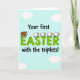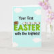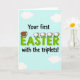 The front design shows large, slightly textured green letters spelling “EASTER” across the center, with a grassy look that feels fresh for spring 🌷. Five small sheep stand in a line on top of the letters, leaning forward as if following one another with a friendly, close-knit rhythm. The first sheep has warm brown fleece, and behind it are four white sheep with rosy cheeks, their tiny dark legs and simple faces giving them a gentle, affectionate presence 🐇. The background is a soft sky blue with scattered puffy white clouds that keep the scene light and airy. Near the top, the words “Your first” appear in small, rounded black lettering above the sheep. Beneath the green letters, “with the triplets!” is placed in matching black text, centered and easy to read. The palette balances green, blue, white, and brown, with the sheep arranged neatly along the tops of the letters and clouds floating behind them.