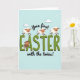 This card features a pale blue spring-sky background sprinkled with tiny white stars and dots, setting a gentle, airy scene 🌷. Across the center, the word “EASTER” appears in large, rounded green letters with a soft, leafy look. Three fluffy sheep-like animals with white wool, brown faces, and perked ears sit atop the letters E, S, and R, leaning close as if sharing a friendly, affectionate moment. A smaller, rust-brown one curls inside the open space of the letter A, tucked in like it’s being lovingly included. Above and around the main word, dark charcoal cursive-style text is placed in two parts, with “Your first” near the upper left and “with the twins!” near the upper right. Two simple white clouds float near the top, balancing the layout and keeping the focus on the center 🐰. The green lettering is thick and rounded, and the little sheep figures have soft white bodies outlined clearly against the sky-blue background.