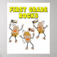 First grade rocks text with three happy rocks holding 1st grade flags is a funny education gift design for parents, elementary school teachers and students.