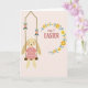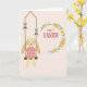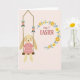This card shows a stylized long-eared bunny sitting on a rustic swing at the left, colored soft beige with rosy cheeks and a small, gentle smile 🐰. The bunny’s relaxed pose and sweet expression feel like it’s waiting for a friend, adding a quiet, affectionate tone to the scene. It wears a simple coral-pink top with thin horizontal stripes, keeping the look soft and cozy. The swing hangs from two rope lines that are decorated with tiny pink flowers and small green leaves, like a little garden wrapped around the seat 🌷. On the right side, a curved border of blossoms in sunny yellow and warm orange, mixed with slender green stems, arches around the main message. The text reads “Happy 1st EASTER,” placed to the right of the bunny, with “Happy” above and “1st EASTER” below in a rich, darker tone that stands out clearly. Behind everything is a pale pink background, and the flower arc forms a bright crescent framing the words.