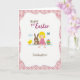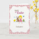 This design shows a digital illustration framed by a scalloped white border, with a soft pink background patterned with small geometric shapes. In the center, a smiling blond child sits on a patch of green grass, leaning slightly toward a brown long-eared bunny 🐇 as if sharing a quiet, friendly moment. A small yellow bird stands nearby, angled toward the pair like it’s joining their little circle. Beside them rests an oval egg decorated with horizontal stripes in teal, yellow, pink, and deep blue, adding a bright accent against the pastels. Above the scene, a single white cloud floats in the pale sky while a tiny turquoise-winged insect hovers close by 🌷. Any greeting text would sit near the top of the design in a light, spring-toned color, leaving the characters unobstructed. The child’s rosy cheeks, the bunny’s long ears, and the striped egg sit neatly on the green ground beneath the scalloped border.