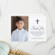 Elegant First Holy Communion thank you card with photo template and your custom thank you message. Dark blue, elegant cross on a white or custom color background. You can change all colors in the design tool.