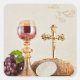 Celebrate a child’s First Holy Communion with this beautiful sticker featuring a chalice, host, bread, wine, and grapes. The design includes elegant scrollwork at the top, where text can be personalized with a name, date, or special message. Perfect for decorating invitations, envelopes, party favors, or keepsakes. This sticker is a meaningful and timeless way to commemorate this special sacrament.