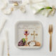 Celebrate a beautiful First Holy Communion day with elegant personalized paper plates featuring a reverent Eucharistic design of a chalice, host, bread, grapes, and cross. Set on a soft ecru background, the warm tones and classic imagery create a timeless look that is perfect for after Mass gatherings, family receptions, and parish celebrations. Customize with your child’s name to create a meaningful and coordinated detail for your event. This design is also available on napkins, cups, and stickers, to match your Communion décor perfectly.